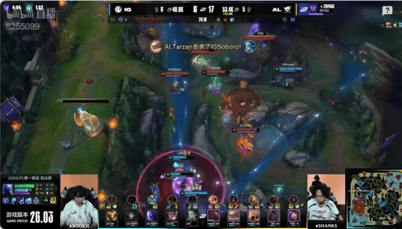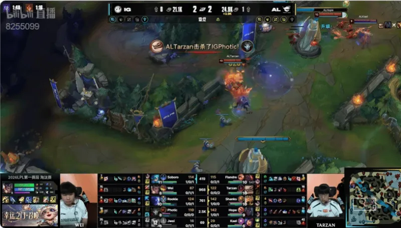 20分钟:IG集火想要击杀沙皇但是被对方丝血逃脱,AL集结反打击杀对方四人打出零换四